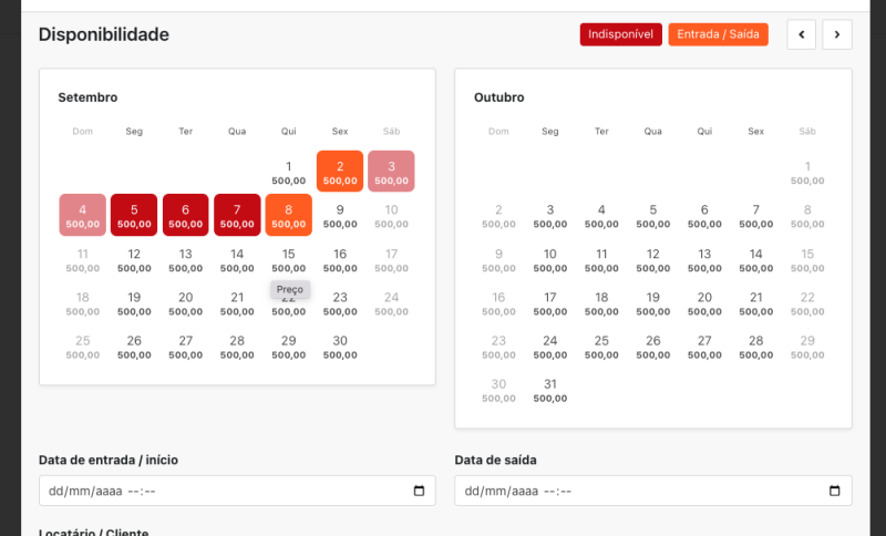 Além disso, o valor de diária é exibido diretamente no calendário.