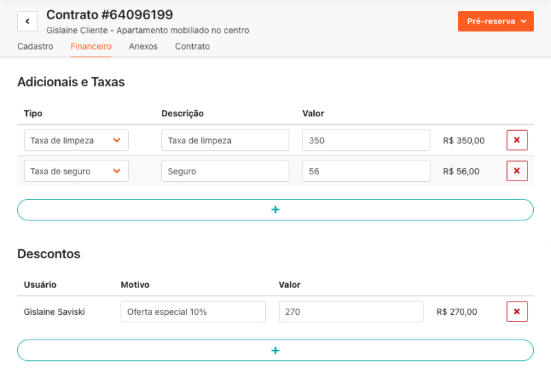 Agora é possível adicionar taxas ou outros valores que serão cobrados do inquilino. Além disso, é possível registrar os descontos concedidos ao cliente: