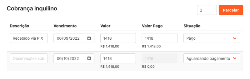 O valor do aluguel é exibido nesse campo, e é possível personalizar a quantidade de parcelas, vencimento e a situação: