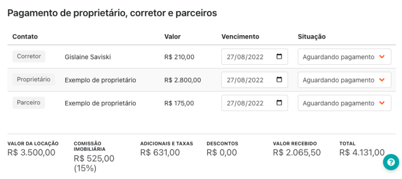 Os valores referentes a repasses são exibidos no campo "Pagamento de proprietário, corretor e parceiros":