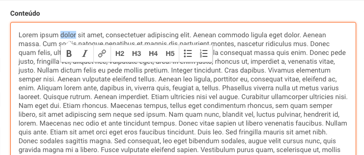 Para habilitar a formatação, selecione a palavra ou frase desejada no texto, e o sistema irá exibir as opções de formatação.