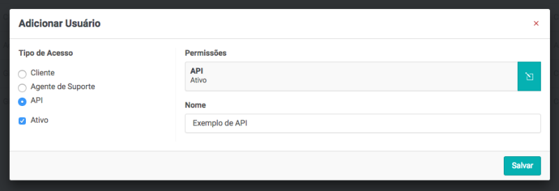 Após adicionar as permissões, selecione a opção API, informe o nome para seu usuário e clique em salvar.