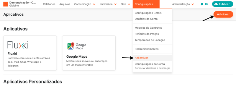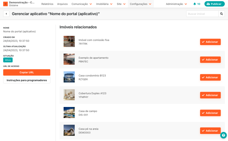 Você será redirecionado para a página para escolher os imóveis e visualizar os detalhes do aplicativo configurado, conforme a imagem abaixo: