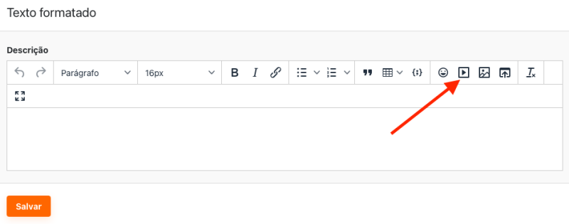 Em seguida, no editor de texto, clique no botão para incorporar o vídeo, conforme a imagem abaixo: