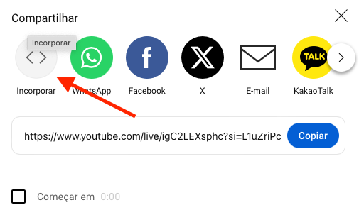 Cole o código que você copiou do YouTube no campo incorporar, conforme a imagem abaixo: