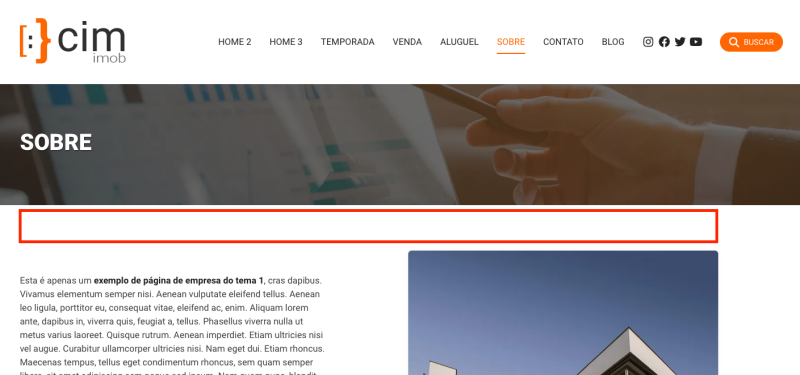 Neste exemplo vamos adicionar o vídeo na páginas sobre a imobiliária, logo abaixo do topo da página: