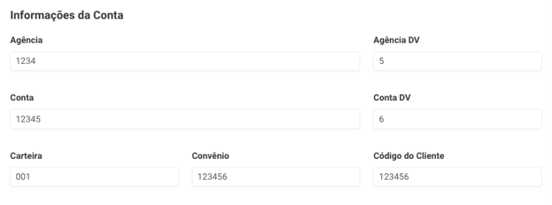 Preencha os dados da conta, tais como agencia, número da conta, carteira, convênio e código do cliente. Essas informações serão utilizadas para gerar o arquivo de remessa e validá-los no programa de envio do arquivo de remessa do banco.