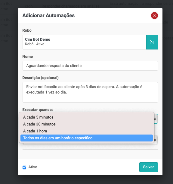 - Executar quando: Intervalo de tempo que a automação será executada;