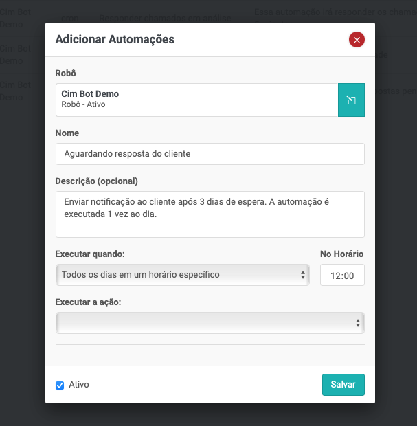 Para finalizar a configuração da automação clique em Salvar. Pronto, a automação está configurada no sistema e será executada conforme definido no cadastro.