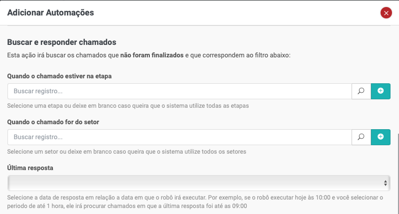 Aqui o sistema considera todos os chamados em aberto no sistema, que estão na etapa que você escolher e a última resposta é igual ou maior que o tempo escolhido.