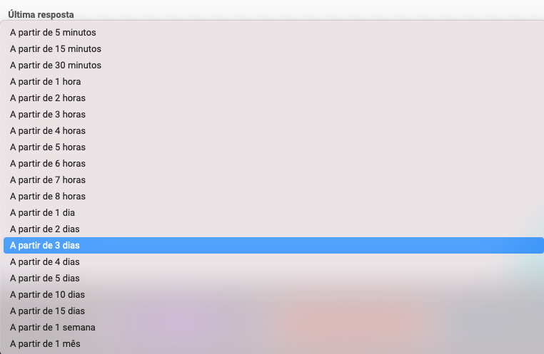 Em seguida selecione o tempo desde a última reposta. Você poderá escolher de 5 minutos até 1 mês.