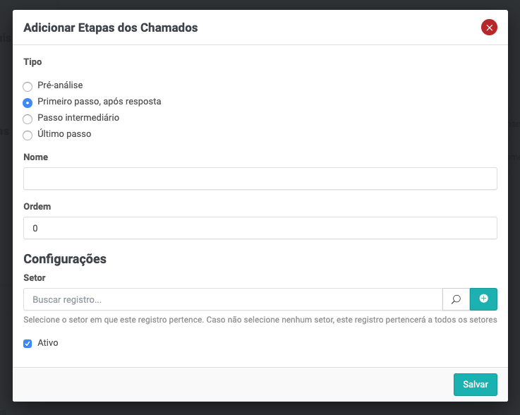 Se o campo setor for preenchido, a etapa será exibida apenas nos chamados daquele setor. Este é um campo opcional, ou seja, se você não preencher, a etapa será exibida nos chamados de todos os setores.