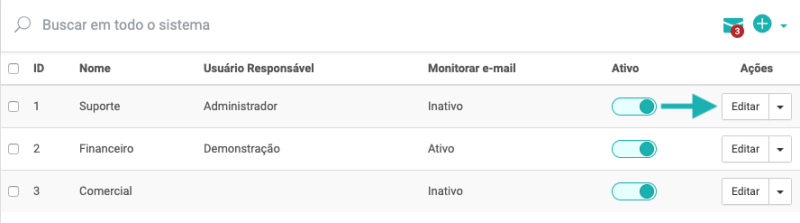 No formulário de cadastro do setor, selecione o item Monitorar E-mail: