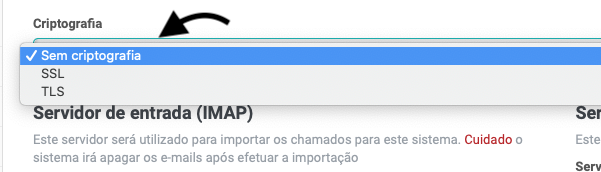 - Criptografia: Tipo de criptografia do servidor de e-mail. Se o seu servidor de e-mail é o Google, utilize a criptografia TLS. Se está utilizando outro servidor de e-mail, selecione a opção Sem criptografia.