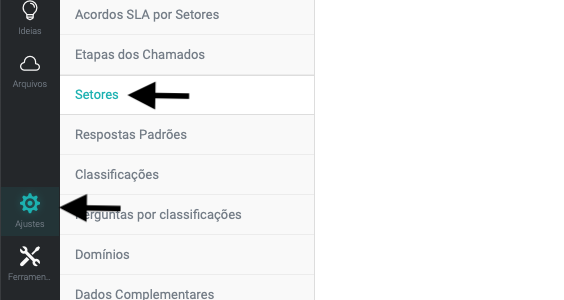 Para configurar o e-mail por setor, após logar no sistema, acesse o módulo Ajustes, em seguida clique no item Setores, conforme a imagem abaixo: