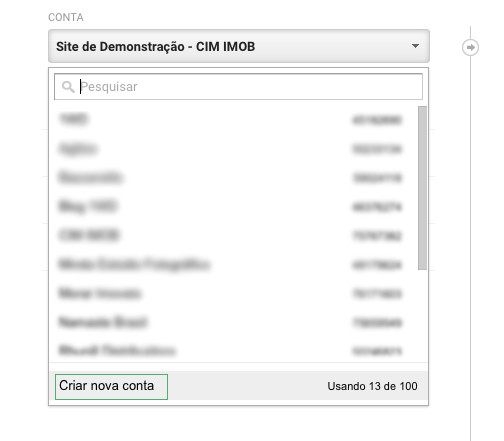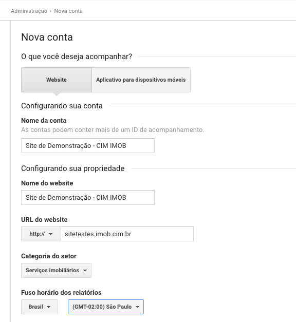 Você será direcionado para a página Nova Conta, preencha as informações solicitadas, conforme mencionado no item Como criar a conta no Google Analytics. Agora é só configurar o Google Analytics no CIM IMOB.