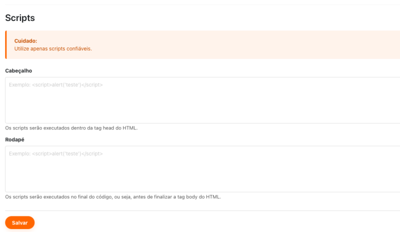 Após acessar as configurações role para o final da página e encontre a área de Scripts, conforme a imagem abaixo: