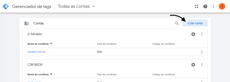 Após fazer o login, você será direcionado para a página inicial. Se for a primeira vez que está utilizando o Tag Manager, não irá aparecer nenhuma conta na lista e será necessário criar a conta.