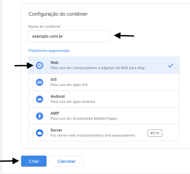 Selecione a plataforma, caso seja um site marque a opção Web.