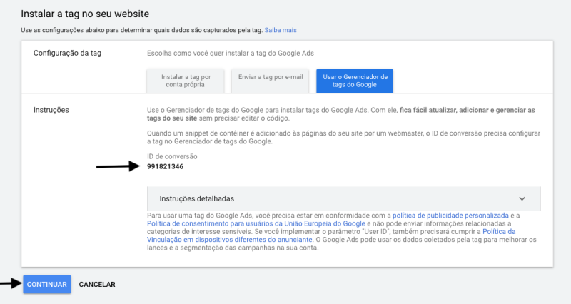 Na próxima tela, selecione a opção Usar o Gerenciador de tags do Google. Copie o ID de conversão e clique em Continuar e em Concluído.