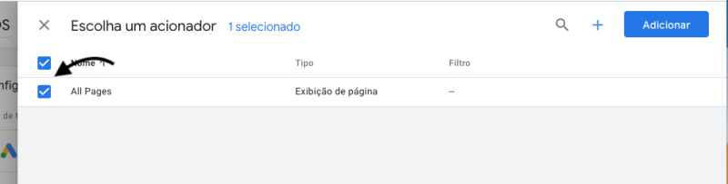 Selecione as páginas desejadas. No exemplo a tag será carregada em todas as páginas. Se não for o seu caso, clique no botão + para adicionar a página desejada.