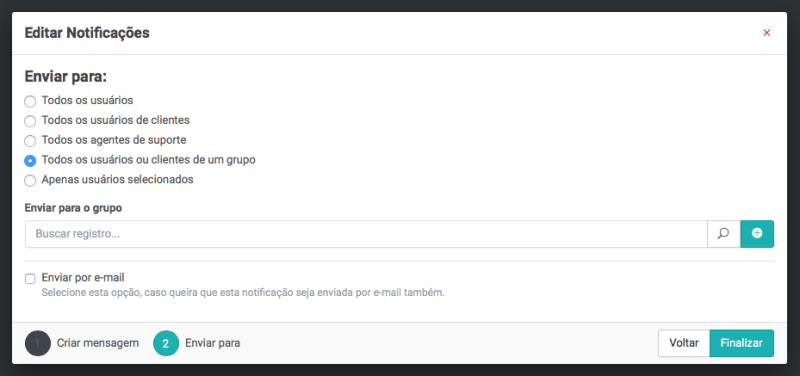 Na imagem acima, selecionamos a opção Todos os usuários ou clientes de um grupo, neste caso será necessário selecionar o grupo de usuários que irá receber a mensagem.