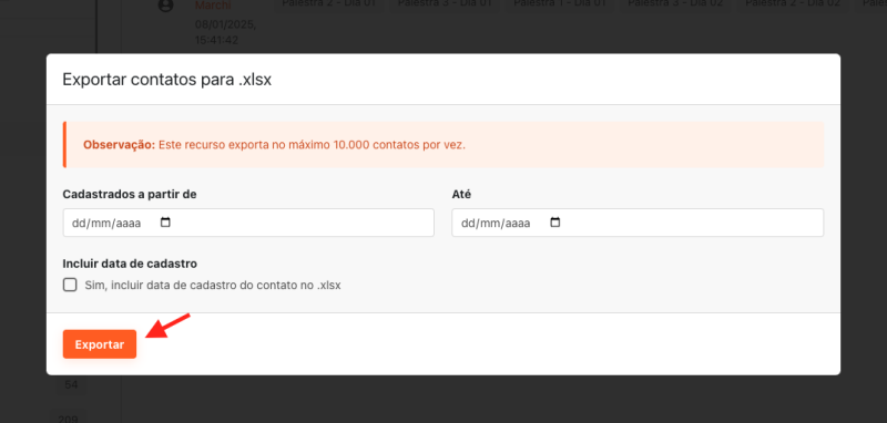 Ao deixar o campo de data vazio, serão exportados todos os contatos que estão no grupo, independente da data de cadastro.
