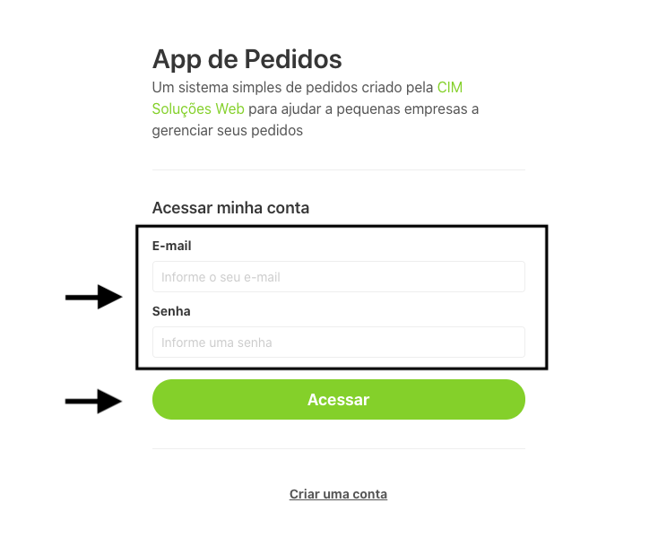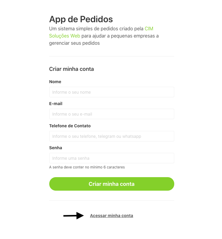Se você já tem uma conta no aplicativo de pedidos, ao acessar o endereço https://cimsw-pedidos.web.app/ o sistema irá exibir a página de cadastro.
