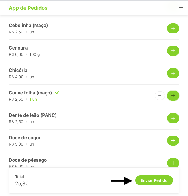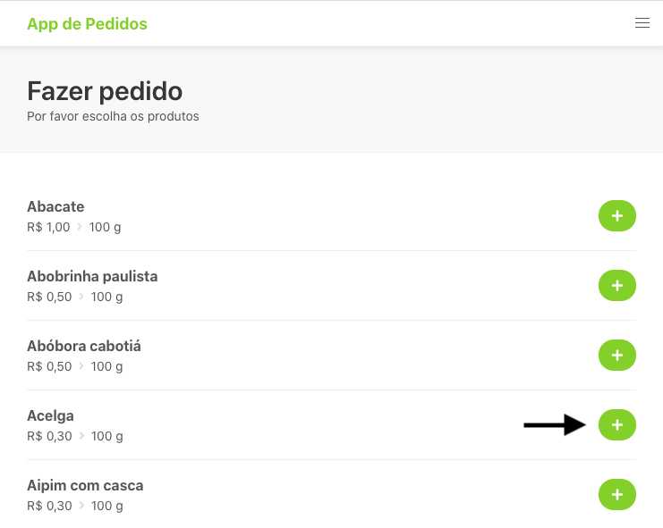 Para adicionar o produto no pedido, clique no botão + (ao lado do nome do produto):