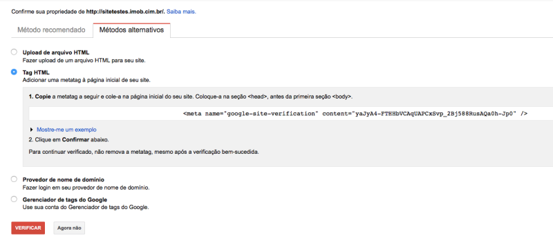 Para gerar a meta tag do seu site, após adicionar a propriedade, selecione a aba Métodos Alternativos e escolha a opção Tag HTML. Ao escolher está opção o Google irá gerar a tag, conforme iumagem abaixo: