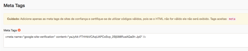 - Na página de configurações encontre o item Meta Tags e insira o código gerado anteriormente, conforme imagem abaixo:
