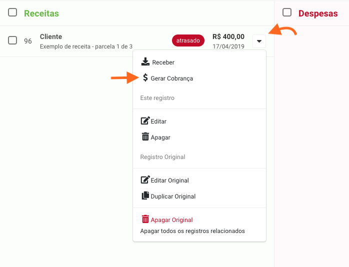Para gerar uma cobrança a partir do registro financeiro, encontre o registro desejado na lista e clique na seta (ao lado de valor), conforme a imagem abaixo: