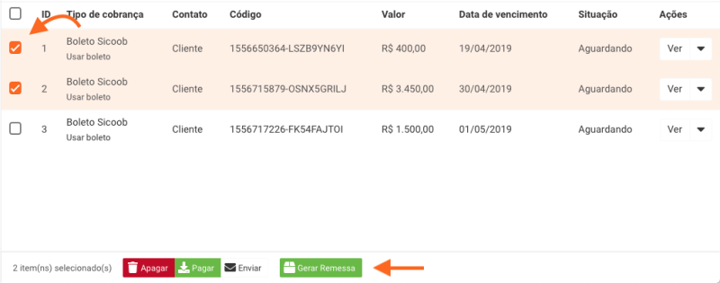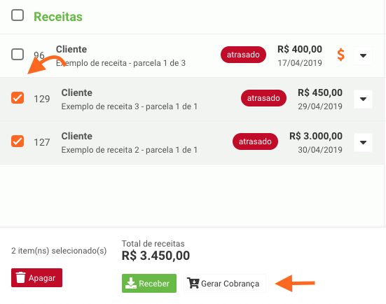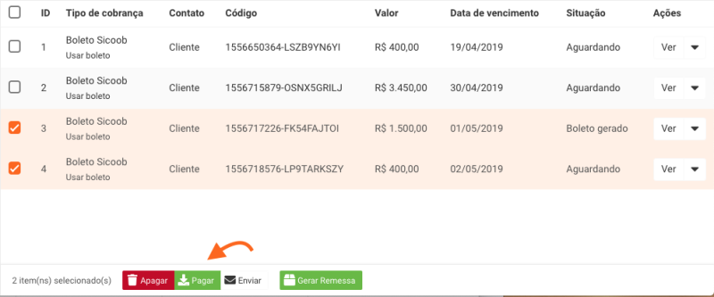 Selecione os registros que deseja receber e em seguida, clique em Pagar.