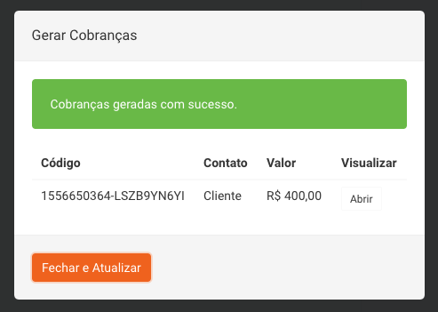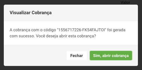 Após, clique em Salvar. O sistema irá exibir o código da cobrança gerada e dará a opção para visualizar a cobrança ou fechar a janela: