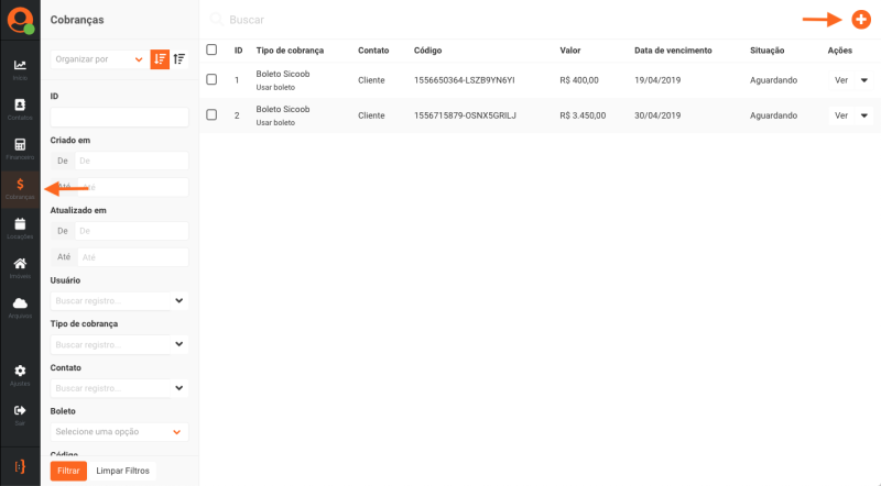 Para gerar a cobrança acesse o módulo Cobranças e em seguida clique no botão (+) para adicionar a cobrança, conforme a imagem abaixo: