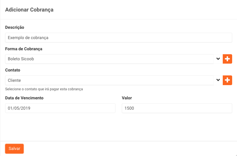 O sistema irá abrir o formulário para cadastro da cobrança, preenche os campos solicitados, conforme exemplo na imagem abaixo: