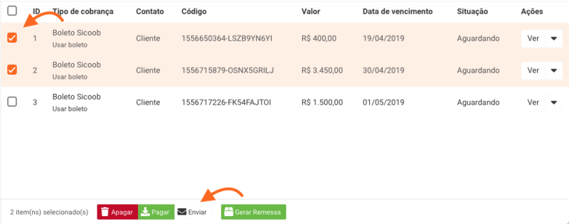 Para enviar a cobrança por e-mail, selecione os registros desejados e clique em Enviar, conforme a imagem abaixo:
