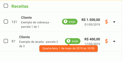 Quando a cobrança é recebida no módulo de cobranças, o registro financeiro também será atualizado, como podemos ver na imagem abaixo: