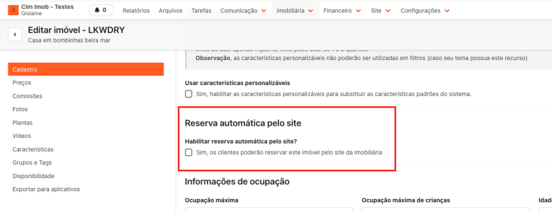 No formulário de cadastro do imóvel, encontre a opção Reserva automático pelo site e marque o checkbox para habilitar o imóvel.