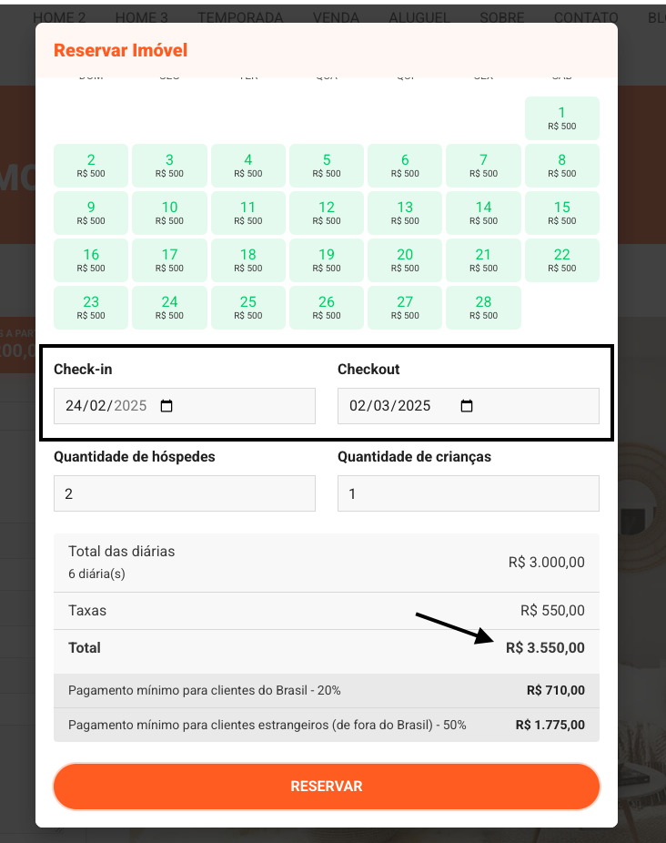 4. Ao selecionar a data de Check-in e Checkout o campo de valores é exibido. Nesse campo será exibido o valor total de diárias, taxas e o valor total. Além disso, é informado qual é o valor da entrada ou taxa de reserva.