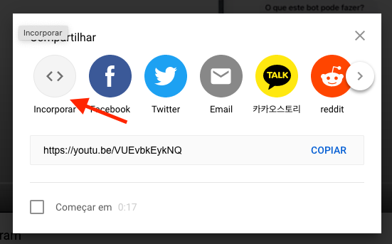 Nas opções de compartilhamento do YouTube, escolhar Incorporar: