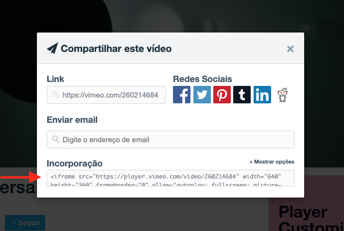 Acesse o Vimeo e encontre o vídeo que deseja adicionar o post. Abaixo do vídeo, clique em Compartilhar.