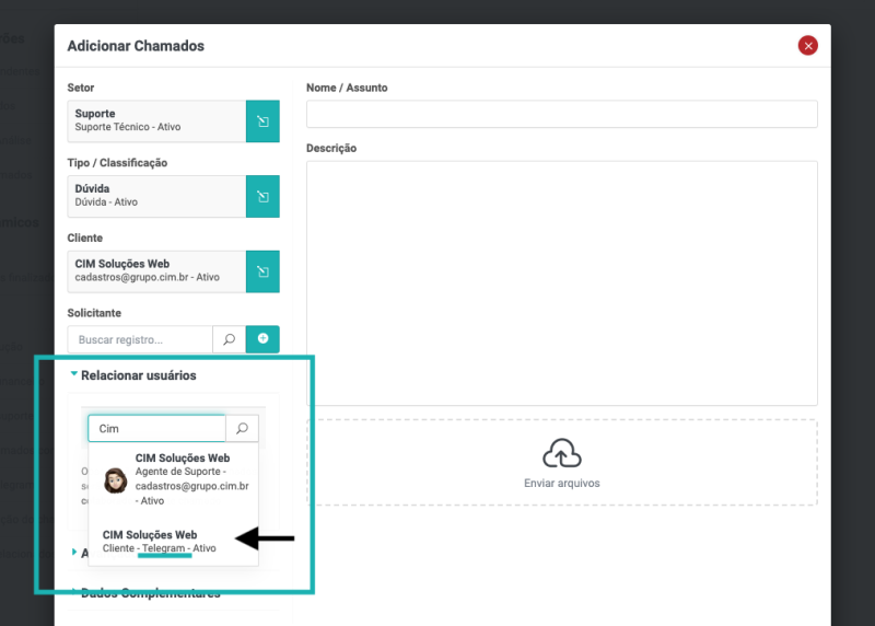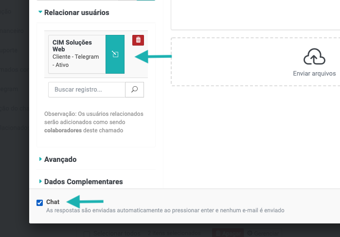 Atenção: Caso já exista algum chamado do tipo chat do Telegram, ativo para o usuário, ele será desvinculado, ficando ativo apenas o último chamado que foi criado.