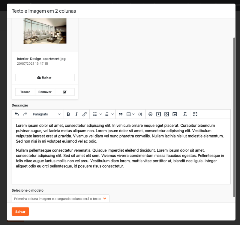 Preencha o componente com o conteúdo desejado, e sempre lembre-se de clicar em Salvar para finalizar.