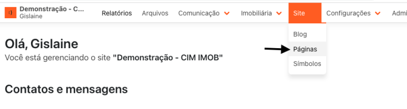 Para acessar o editor de páginas, faça login na sua conta do Cim Imob 3.0, em seguida no menu principal clique em "Site > Páginas":