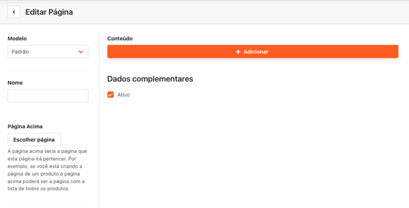 O editor de página é composto por um formulário de cadastro, onde você irá escolher o modelo de página, definir o nome da página, configurar os componentes (elementos da página) e configurar o SEO.
