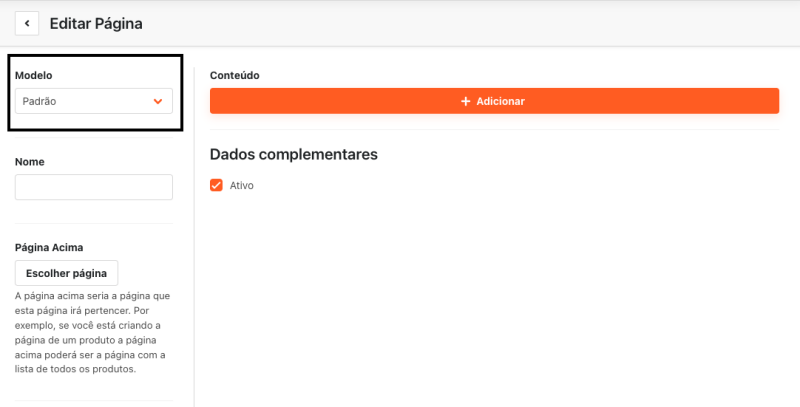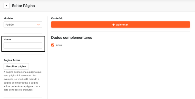 Após definir o modelo da página, informe o nome da página. Lembre-se de utilizar um nome único por página.