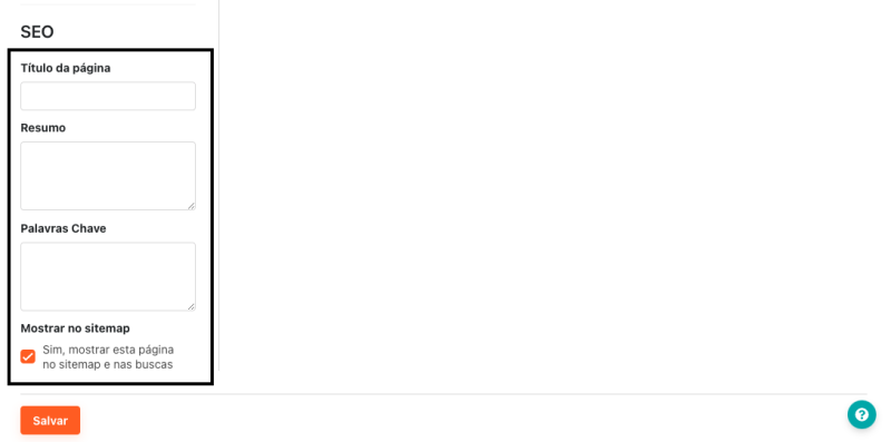 Outro item que pode ser configurado é se a página deve ser exibida no Sitemap do site, ou seja, se a página ficará visível no Google. Recomendação: Desmarque essa opção apenas quando a página não deve ser encontrada pelo buscadores como o Google, como por exemplo páginas de campanha.