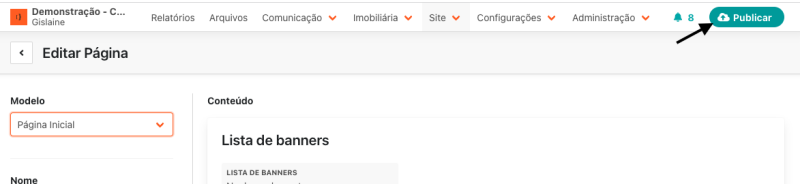 Após editar ou adicionar as páginas do site, será necessário publicar o seu site. Para fazer a publicação, no menu principal clique em Publicar: