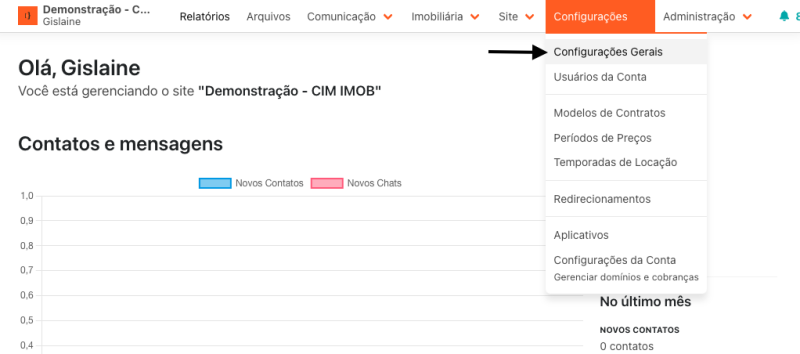 Para personalizar o menu do site, no sistema no menu principal clique em Configurações > Configurações gerais: